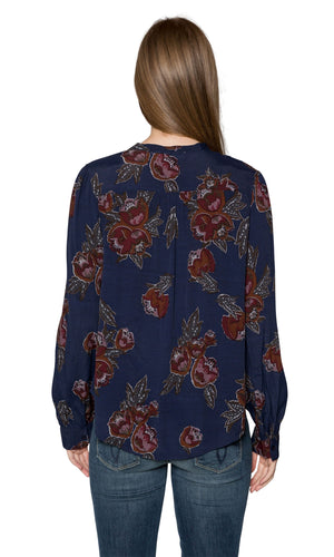 This vintage-inspired floral print by ASTR has a chic boho feel making a statement all on it's own. The Estelle shirts features floaty long sleeves with single button closures. To keep our boho feel rocking the Estelle has a split neck with a versatile tie closure so you can take the ties and place them in a bow or they can let them dangle for a more casual feel. It also has a curved hem on the back. Available in a Navy floral print. Fabric is 100% rayon. Dry clean. Made in China.
