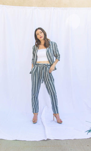 These stylish linen pants are the perfect versatile piece to add to your closet. Â The Linen Striped Pants by designer Haris Cotton feature a belted waist with an accent tie waist and a button closure. Â The pants have pockets and a stylish linen fabrication in contrasting shades of grey. Â The pants can be paired with the matching jacket if you want to wear it as a set or stand alone. Â Available in Grey Stripes with contrasting shades of grey and navy accents. Â Model is 5'9" and wearing a size Small. Â Fabric is 100% Linen. Â Made in Greece. Â Machine wash or dry clean. Â Do not tumble dry.