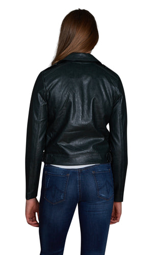 This faux leather jacket looks like the real deal. J.O.A. Faux Leather Jacket is the perfect layering jacket for Fall! It's a great fall color lined in black to make a statement. Features include zip front closure, shoulder snap epaulets, two front zip pockets, 2 side adjustable buckle belts at hem. This fully lined jacket will complete your fall look. Fabric is 60% Polyurethane, 40% Rayon, Lining; 100% Polyester. Made in China.