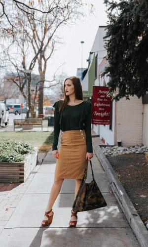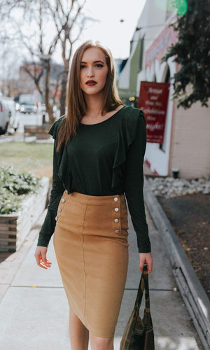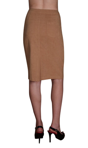 J.O.A. has created a super soft faux suede skirt with buttons that is comfortably lightweight to wear. This camel colored pencil skirt features silver button front closures, two back pockets with a vented back slit The length of this skirt is knee-length. Available in Camel. Fabric is 100% Polyester. Dry clean only. Made in China.