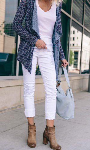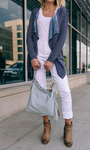 A total go to cardigan, this Open Drape Lightweight Cashmere cardigan by designer Knitwit is a true grab and go piece. Featuring a lightweight cashmere fabric this cardigan has long sleeves and an open drape cascading front. The Navy Denim Cross is a navy blue print with a contrasting light blue and red pattern. There is also red stitching at the seams and trim for added contrast. This soft lightweight cardigan will add an extra element of style to your look. Fabric is 100% Cashmere. Dry Clean recommended. Hand made in Nepal.