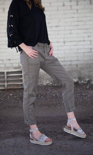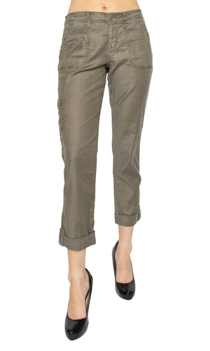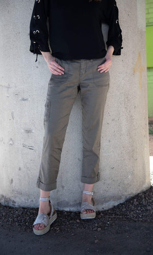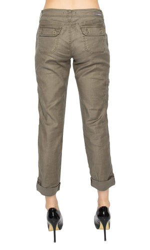 The best-selling Dayla Cargo Pant by designer Level 99 is back this season in the on trend army green color called Sage. Â The Dayla pant showcases a relaxed cargo style that rolls up at the hem with a button loop to hold it in place. Â The functional pockets in front and back also feature a stylish button closure. Â The front features a zip fly closure and belt loops around the waist. Â A perfect way to up your casual fashion game. Â Available in Sage (army green). Â Model is 5'9" and wearing a size 26. Â Please note that this is an intentionally relaxed style fit. Â Fabric is 51% Linen, 46% Lyocell, 3% Spandex. Â Made in China. Â Â Machine wash cold, inside out. Â Gentle cycle recommended. Â Tumble dry low.