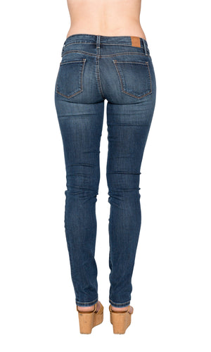 The perfect go to skinny jeans. Â The Lily Skinny Straight Denim by designer Level 99 features a dark wash called Zepplin with tan stitching and whiskering and light distressing on the right leg and near the left hip. Â The light distressing gives it a clean denim style with a subtle edge. Â The jeans have a 5 pocket style with a button closure and a zip fly. Â Available in Zepplin, a dark blue wash with whiskering and light distressing. Model is 5'9" and wearing a size 26. Â Runs true to Level 99 sizing. Â Fabric is 45% Lyocell, 26% Cotton, 13% Rayon, 10% Polyester, 5% Elasterell-Poly, 1% Spandex. Â Lining (interior pockets): 70% Polyester, 30% China. Made in China. Â Machine wash cold, inside out. Â Tumble dry low.Â