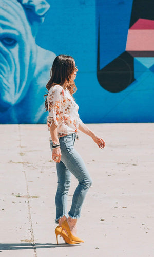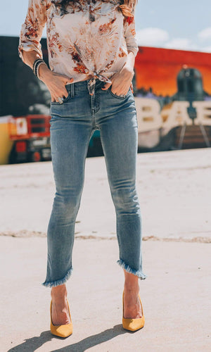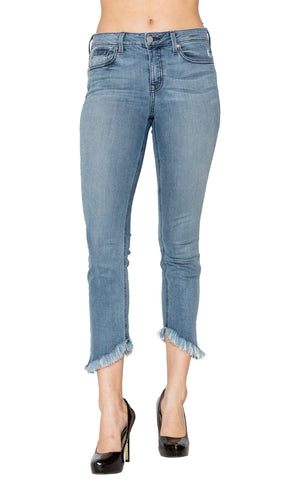 The Liza Mid-Rise 5 Pocket Denim jeans by Level 99 in Mineral Peak features a faded blue wash with whiskering and light distressing down the front pant legs. Â The hem of the legs is cropped and frayed at an angle making these truly distinctive. Â They have the classic five pocket style, a contoured waistband with belt loops, and a zip fly with button closure. Â The Clarity wash features a faded blue finish with light distressing with whiskering. These are jeans that are the perfect blend of stylish and comfortable /easy to wear. Â Fabric is 45% Lyocell, 26% Cotton, 13% Rayon, 10% Polyester, 5% Elasterell-Poly, 1% Spandex; Â Lining 97% Cotton, 3% Spandex. Machine wash cold on gentle, inside out, tumble dry low. Â Made in USA. Â Model is 5'9" and wearing a size 26. Â Fit is true to size with Level 99's regular sizing.
