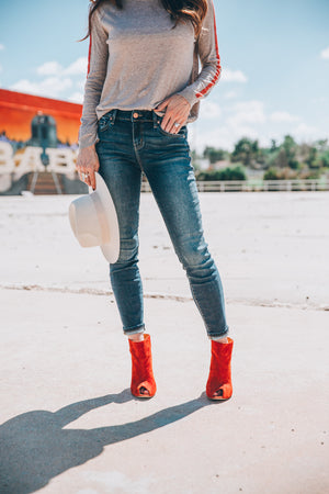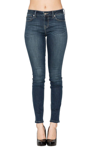 The Liza Mid-Rise 5 Pocket Denim jeans by Level 99 in Mineral Peak features a dark wash with whiskering and fading down the front pant legs and a tan trim accent around the seams for added contrast. Â They have the classic five pocket, a contoured waistband with belt loops, and a zip fly with button closure. Â The Mineral Peak wash features a clean finish with minimal distressing with the whiskering and fading. Â Fabric is 45% Â Lyocell, 26% Cotton, 13% Rayon, 10% Polyester, 5% Elasterell-Poly, 1% Spandex; Â Lining 97% Cotton, 3% Spandex. Machine wash cold on gentle, inside out, tumble dry low. Â Made in China. Â Model is 5'9" and wearing a size 26. Â Fit is true to size with Level 99's regular sizing.