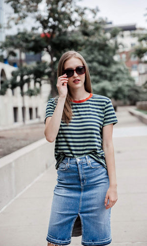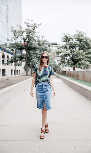 If there is one skirt that looks good on every woman, regardless of her shape, size or age it's the A-line denim skirt. And we've got a fashion forward jean skirt by Level 99 with all the detailing you need too. This Penny skirt features a zip fly with button closure and has the five-pocket style. A released hem brings instant lived-in appeal to this perfectly light wash denim skirt. Finished off with some subtle whiskering and front slit for a cool distressed look. Specs: Length-32 1/2. Fabric: 61.5% Cotton, 32% Lyocell, 5% Elasterell-Poly, 1.5% Lycra. Machine wash inside out recommended. Made in USA.