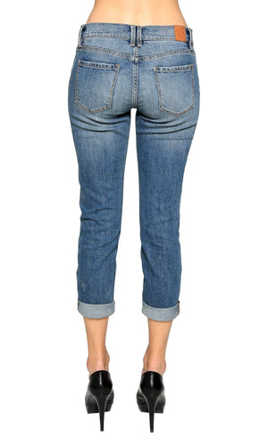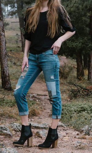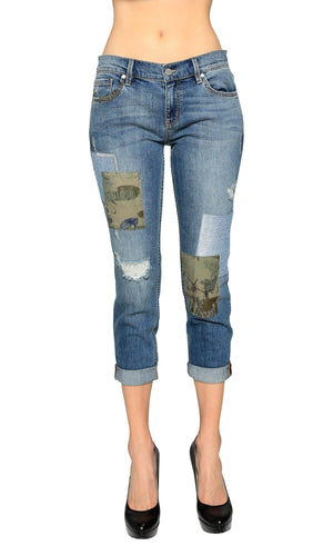 We have the the jeans that will set you apart from the crowd. And this go around Level 99 has added a touch of sophistication to these boyfriend cut jeans. These jeans feature jacquard Japanese cherry blossom patches down both legs. The patches make for a wonderful addition enabling you to express your personality. Other features to these relaxed fit jeans include a ripped knee and rolled cuffs. The prince color is a medium wash. Specs: Rise-9 1/4", Leg Opening-12 1/4", Inseam-28". Fabric: 80% Cotton, 12% Rayon, 7% Polyester, 1% Spandex. Machine wash, inside out. Tumble dry low.