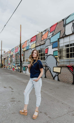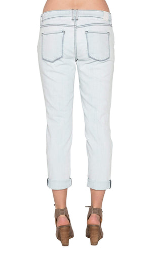 These faded denim boyfriend jeans color is called Sea Scape and are made for spring / summer. This is a vintage bleached denim wash jean that features a slightly tapered leg and a rolled cuff. These easy going relaxed fit jeans sit a little lower on the hip and have a slightly tapered leg. This denim will give you just a touch of edge with the rips and distressing down the legs. Specs: Rise-9 1/4", Leg Opening-12 1/4", Inseam-28". Fabric is 80% Cotton, 12% Rayon, 7% Polyester, 1% Spandex. Machine wash, inside out recommended. Made in USA.
