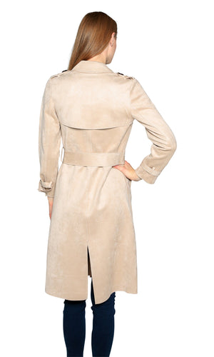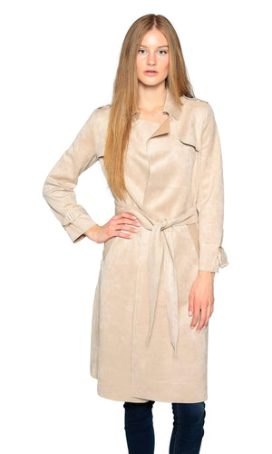 A lux trench coat the Adrianna Faux Suede trench coat by Love Token is a must have. This long and elegant velvety soft faux suede jacket is unlined and can be wrapped around you with a detachable sash-tie belt to easily adjust to your ideal fit. Other notable details to this coat are two pockets, a notch collar and long sleeves with belted cuffs. Available in Blush (a nude pink color). Fabric is 92% polyester, 8% spandex. Faux suede. Hand wash cold, dry flat. Imported from China.
