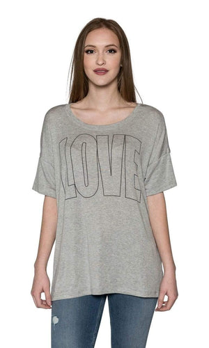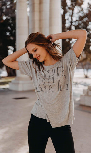 The perfect statement top, the Love Deep Sleep Tee is literally so soft and cozy you will want to wear it everywhere. Showcasing a heather grey sweatshirt color with the Love outlined in Black on the front this graphic tee is the perfect blend of the latest trends with a cozy feel. The perfect tee for lounging around the house for the weekend or out and about. Made from Sundown by River + Sky's premium eco luxury sweater knit. Fit is boxy and intentionally oversized the perfect sleep tee. Fabric is 95% Modal, 5% Spandex (Eco, Lenzing certified). Machine wash cold gentle cycle, inside out recommended. Lay flat to dry. Made in USA.