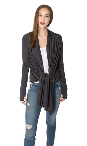 We love go-to cardigans like the Waterfall Cardigan by designer LAmade. Â It's so soft it feels comfy and lux at the same time making it a must have. Â This cardigan features a long open drape front that hits at the knee on our 5'9" model. Â The back is shorter with a length right at the hips. Â The micromodal fabric makes it super soft. Â The sleeves have finger slits making it even more versatile. Â Perfect as a go-to cardigan to keep in your purse or carry-on. Â Available in Lunar Rock (beige) and Raven (dark grey). Â Model is 5'9" and wearing a size Small. Â Fabric is 95% micromodal (which makes it super soft), 5% spandex. Â Made in USA. Â Â Machine wash cold, reshape and lay flat to dry.Â