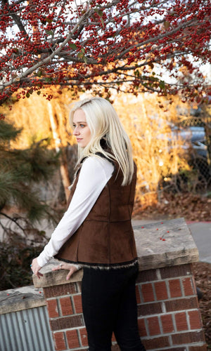 A spin on a classic vest style, the Miley Faux Fur Vest by designer Love Token features a more fitted style than other similar style vests with an optional hook eye front closure if desired. Â The exterior of the vest is a super soft faux suede and the interior and collar trim is a soft faux fur in a sable blend of colors. Â The vest has pockets in the sides and has styled seams on the exterior for added detail. Â Available in Brown with Sable color faux fur interior. Â Fabric isÂ