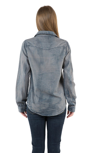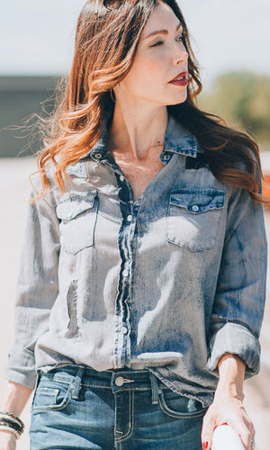This classic snap-front denim shirt has so many subtle details by designer Nu Vintage. There are pointed seams at the shoulders and two snap-close chest pocket flaps for subtle detail. Pearl-like snaps add a feminine accent and elevate the look. There are two snap closure at the cuffs. Then Nu Vintage has made two deliberately ripped areas on the shoulder and the front of the shirt filled in with black patches to add a unique character. And last but not least there are small fray marks throughout this blue/grey top giving it a unique weathered look. Available in Grey. Fabric is 100% cotton. Machine wash cold, tumble dry low. Made in USA.