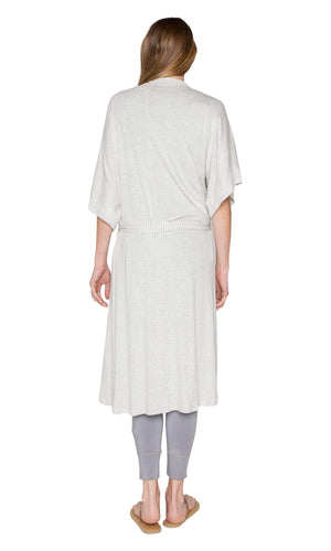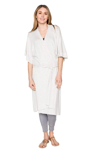 This cozy Soften Up Robe by Sundown by River + Sky is the perfect blend of style and comfort. True to it's name, the Soften Up robe is ultra soft and cozy and seriously so comfy you literall will want to live in it. The striped pattern makes this short sleeve robe super stylish as well. The robe has a tie belt on the outside secured with belt loops and a tie on the inside as well to hold it in place. As for length it hits below the knee. Available in Heather Grey / Ivory striped pattern. Fabric is 98% Rayon, 2% Spandex. Machine wash, inside out. Lay flat to dry. Made in USA.