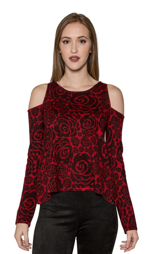 The ever popular Cold Shoulder style top this version in a lux cashmere fabric by designer Knitwit. The lightweight cashmere fabrication features a soft touch and a gorgeous floral pattern. The floral pattern showcases a black rose pattern contrasted with the red. The sweater has a long sleeve and the body of the sweater hits at the hips. Available in Red Rose. Fabric is 100% Cashmere. Dry clean recommended. Hand made in Nepal.