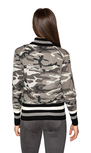 The perfect blend of lux and casual, the Cashmere Track Jacket by designer Knitwit features a stylish track jacket with a stunning camo print. Â Knitwit's collection of printed cashmere is taken to another level with this track jacket. Â Whether you think of it as a jacket or as a zip front cardigan, the sweater features a panel of stripes around the waist, collar and cuffs. Â The front zipper goes all the way to the top with a high collar showcasing the stripes. Â The sweater is more fitted at the waist and hits at the hips. Â Available in Snow Camo. Â Fabric is 100% Cashmere. Â Hand made in Nepal. Â Dry clean only recommended. Â Model is 5'9" and wearing a size small. Â Fit is true to Knitwit traditional sizing. Â