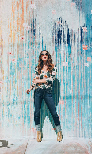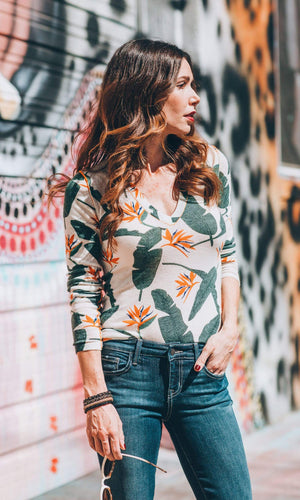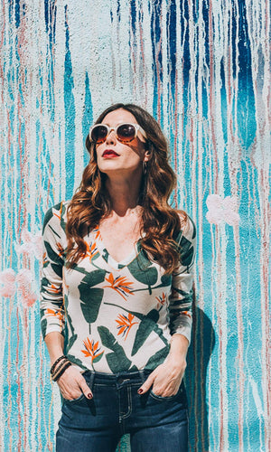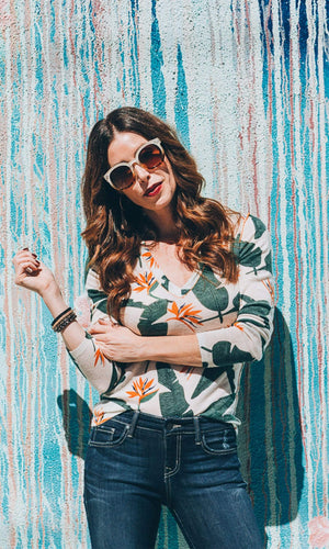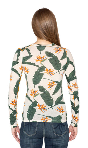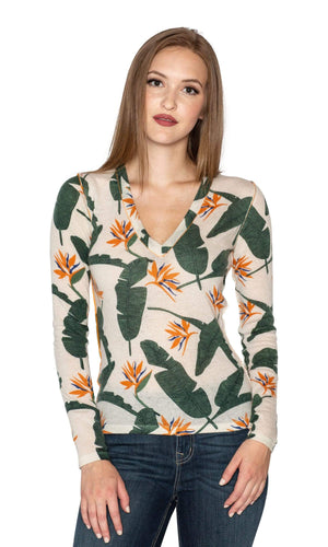Set yourself apart with this distinctive floral print sweater by designer Knitwit. Â This classically styled long sleeve v neck pullover sweater made from Knitwit's distinctive cashmere features a contrast orange stitching around the seams. We love the Birds of Paradise Floral pattern in a palm green color contrasted with orange flowers and trim on an off white body. Â This is a tissue weight cashmere which makes it versatile enough to wear nearly year-round giving you added use for this lux piece. Â Available in Birds of Paradise floral print. Â Fabric is 100% Cashmere. Â Hand made in Nepal. Â Dry clean. Â Model is 5'9" and wearing a size small. Â Fit is true to Knitwit standard sizing.