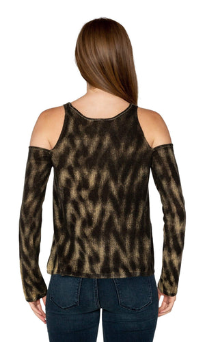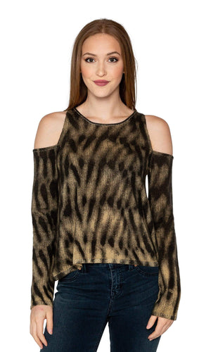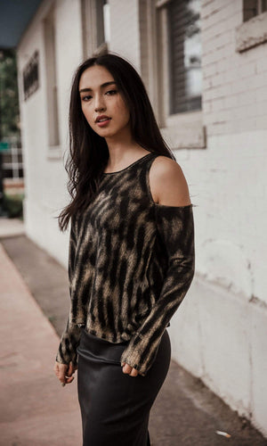 The ever popular Cold Shoulder style top this version in a lightweight cashmere fabric by designer Knitwit. The lightweight cashmere fabrication features a soft touch and a distinctive modern pattern features a pattern of tan brown contrasted with black. No detail was untouched with the contrasting tan stitching accents around the neckline and shoulders. The body of the sweater hits at the hips and the sleeves feature the cold shoulder style at the shoulder and a long sleeve length. Fabric is 100% Cashmere. Dry clean recommended. Hand made in Nepal.