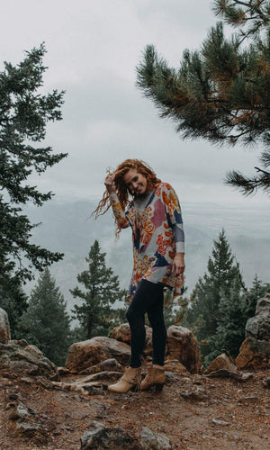 A must have tunic, the Floaty tunic by designer Knitwit features a lightweight cashmere fabrication in their Navy Denim Cross print. The tunic features a wide dolman style sleeve that cuffs around the elbow giving it a 3/4 length and distinctive style. The design of oriental flowers features an ivory base with navy blue, orange, yellow, pink and light grey accents. The hem of the top features slits on each side and a high low hem detail. The top is styled to have a looser fit and drape and is intended to look oversized on the body. Pairs great with leggings. Fabric is 100% Cashmere. Available in Oriental Flowers. Dry clean recommended. Hand made in Nepal.