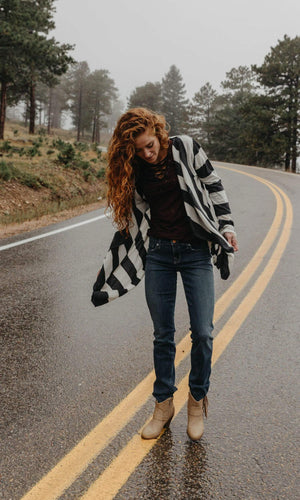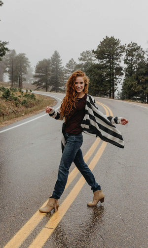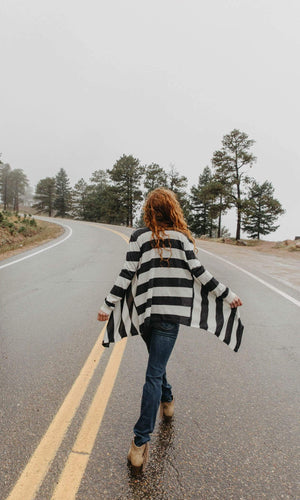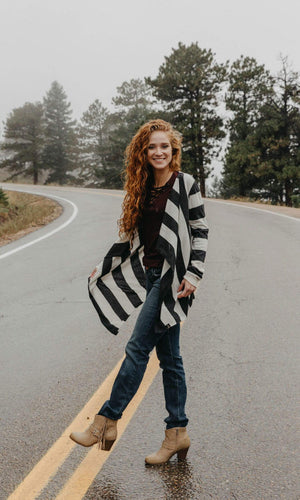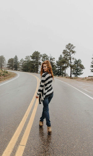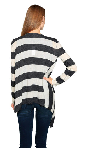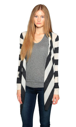 A total go to cardigan, this Open Drape Lightweight Cashmere cardigan by designer Knitwit is a true grab and go piece. Featuring a lightweight cashmere fabric this cardigan has long sleeves and an open drape cascading front. Available in a striped pattern with charcoal grey and off white contrasting stripes. This soft lightweight cardigan will add an extra element of style to your look. Fabric is 100% Cashmere. Dry Clean recommended. Hand made in Nepal.