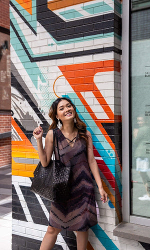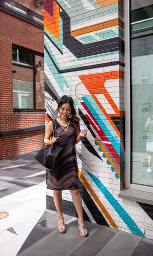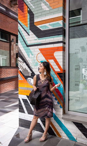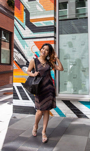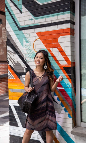 The Astrid dress is a sexy spin on the classic shift dress.  Incorporating on of this season's hottest trends, the lace-up in front and then a deep lace-up with a tie inside in the back. The shoulders feature wide straps that are approximately 2 inches wide and the front bust is lined.  The dress hits above the knee and features an abstract print with shades of grey, purple, mauve and black in a print called Dogmar.  Fabric is 93% Microfiber, 7% Spandex.  Hand wash cold.  Hang dry.  Made in USA.
