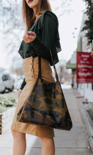 You don't have to be an outdoor enthusiast to love this camo tote. Camouflage print patterns are all throughout the body of this tote with green and black accents. The unlined interior comes with a front slip pocket with magnetic snap closure. Streets Ahead has created an open design that makes it perfect for carrying all your essentials. Keep everything you need close at hand in this handsome leather tote. It is definitely is a style standout. Fabrication is 100% Leather. Measurements: 13" Body length, 9" Shoulder drop, 16" Body width, 6" Side width.