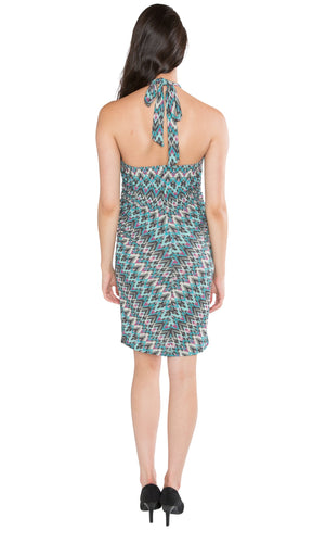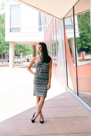 With warmer weather here it's time to highlight your collarbone and shoulders with this Hershel dress by Viereck. It features zig zags covering the entire dress creating a beautiful and unique print. Multi colors of teals, purples, greys, blacks and ivory zig and zig effortlessly to become a summer staple with this cool halter style dress. Ruching at the sides create a curve-flattering fit. Fabric is 93% polyester, 7% elastane. Hand wash, cold water. Hang dry. Made in USA.