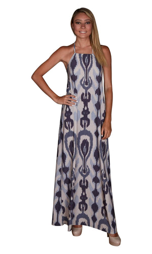 Make a dramatic entrance in this boho style halter maxi dress from Deborah Viereck. This stunning abstract Marley print on this Jalisco maxi dress will set you apart from the crowd no matter where you are. Just prep your closet with these splashes of greys and purple on this comfy and stylish maxi dress. Available in Marley print. Fabric is 93% Microfiber, 7% Spandex.  Hand wash, hang to dry. Made in USA.