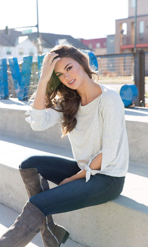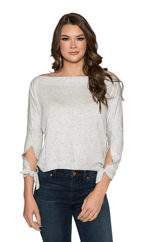 River & Sky showcases a stylish mix of feminine details in the Sweetwater Tie Sleeve High Low Sweatshirt.  The Sweetwater top is a lightweight top in a sweatshirt style with a sleeve that slits and ties at the cuff.  The body features a boatneck so it easily falls off the shoulder if desired.  The hem of the top features a rounded high low hem that is higher in the front and lower in the back. Available in Ash.  Fabric is 95% Modal, 5% Spandex. Machine wash cold inside out with similar colors.  Lay flat to dry. Made in USA.