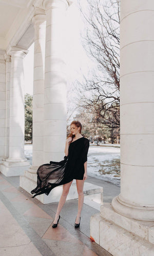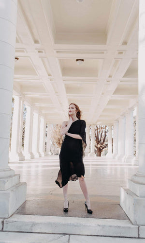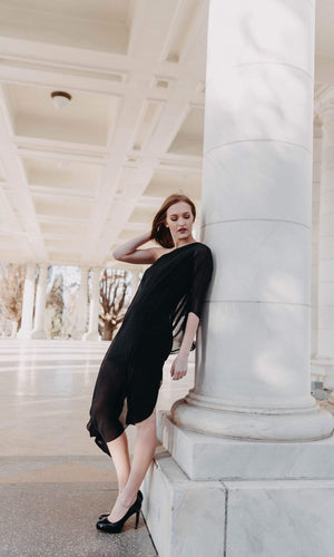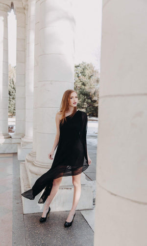The perfect party dress, the Jasmine One Shoulder Drape Dress by Analili is a true showstopper. The dress features a one shoulder asymmetric style with an over layer of chiffon that naturally drapes over one arm and the body of the dress. The chiffon drape looks gives the dress a more elegant look. The chiffon lining is attached directly to the dress. The body of the dress hits above the knee by several inches. The chiffon drapes in also asymmetrically below the knee. Available in Black. Fabric is 100% Polyester. Combo: 95% Polyester, 5% Spandex. Hand wash cold, hang dry or dry clean. Designed in Miami, FL. Assembled in El Salvador.