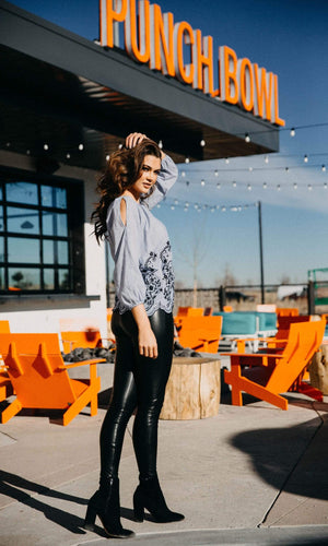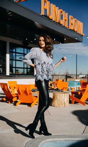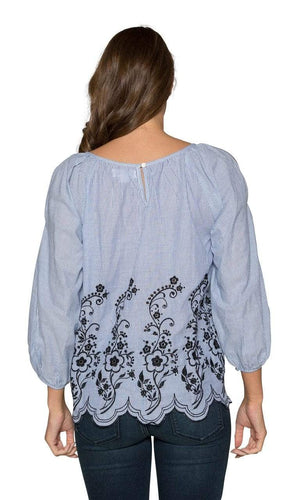 The Reagan Embroidered Stripe Slit Sleeve Top perfectly incorporates so many style trends this season, statement sleeves, embroidery, stripes and feminine styles. The Reagan features a pinstripe style fabric with light blue stripes embellished with a slit at the sleeve near the top of the shoulder giving it a sexy flair. The body ad hem of the top are embellished with a floral embroidery pattern in black for contrast and the hem of the top features a scalloped edge another feminine detail. The back features a keyhole button closure and the cuffs of the sleeves are gathered with a button closure as well. Fabric is 100% Cotton, embroidery is 100% Polyester. Machine wash cold, tumble dry low. Made in India.