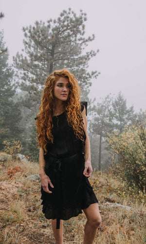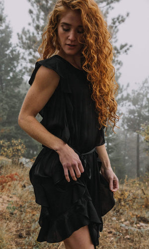 Get the crowds attention with this sophisticated dress from Velvet by Graham and Spencer. The Tenley features luxe satin viscose and cascading ruffles running throughout. This satin silhouette features a jewel neckline and a keyhole back. As for length, the dress is cocktail length and hits just above the knee with a swishy ruffle hem. Comes with a sash belt to accentuate your waist. Make a bold fashion statement in this little black dress. Available in Black. Fabric is 54% Viscose, 46% Cotton. Machine wash cold, tumble dry low. Made in USA.