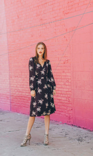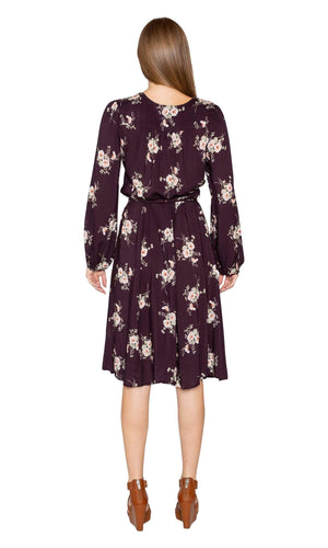 A stunning wrap dress that is easy to wear, the Pomona Floral Printed Challis Wrap Dress has a v neckline with a snap closure. Â The wrap dress has a tie at the waist that wraps around the dress true to the wrap dress style. Â The back features pleats below the shoulders. Â The front ruffles around the knee on this below the knee length dress. Â The long sleeves are lightly gathered and feature a button closure. Â Available in Dahlia, a deep purple floral print. Â Model is 5'9" and is wearing a size Small. Â Runs true to Velvet by Graham & Spencer's standard sizing. Â Fabric is 100% Viscose. Â Made in USA. Â Dress is unlined. Â Dry clean only.