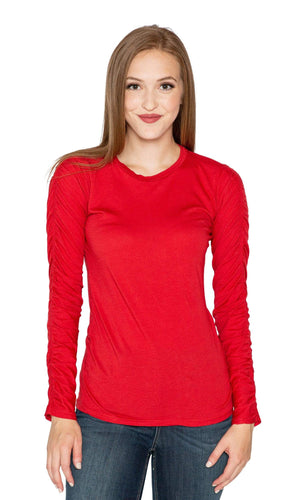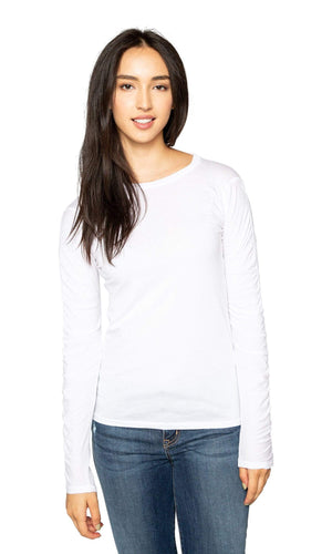 • FEATURES: ruched sleeve, ruched, crewneck, cotton tee, stretch cotton, thin cotton, long sleeve, gauzy whisper collection,