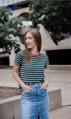 Your new go to -- the Peace Slub Knit Stripe Tee by designer Velvet by Graham & Spencer is a crewneck tee with a retro vibe and a boyfriend tee style. The short sleeves and contrasting crewneck against the stripes make this one of our favorite tees. True to the boyfriend tee style, the Peace tee has a long length and an intentionally looser fit. Available in Garland (white) and Willow (green) contrasted with Navy stripes. Fabric is 50% Cotton, 50% Polyester. Machine wash cold, tumble dry low. Made in USA.