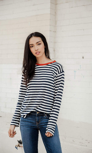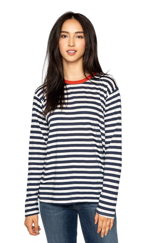 The perfect fall tee, the Renny Slub Knit Stripe Long Sleeve Tee by designer Velvet by Graham & Spencer is a crewneck tee with a retro vibe and a boyfriend tee style.  The long sleeves and contrasting crewneck against the stripes make this one of our favorite tees.  True to the boyfriend tee style, the Renny tee has a long length and an intentionally looser fit.  Available in Garland (white) and Willow (green) contrasted with Navy stripes and a Red collar.  Fabric is 50% Cotton, 50% Polyester. Machine wash cold, tumble dry low.  Made in USA.