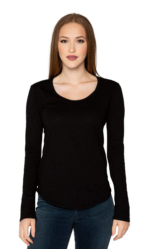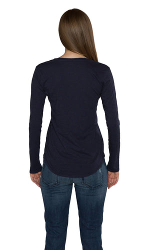 The Adiel Cotton Slub Scoop Neck Top is a great twist on the traditional scoop neck top. The Adiel top blends the scoop neck with a hi low hem. The hem is rounded and is approximately 2 inches longer in back than in front. Of course It is also super comfortable which makes it a consistent go to whenever you need a basic scoop for layering or just to throw on with jeans. The top features a deep scoop neck, long sleeves and long length hitting well below the hips. Available in Black, White, Aztec (blue), Ruby (red), and Medium Heather Grey. Fabric is 100% cotton. Machine wash, tumble dry low. Made in USA.