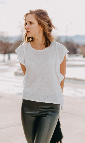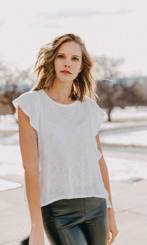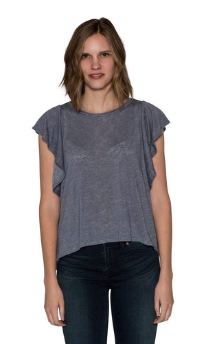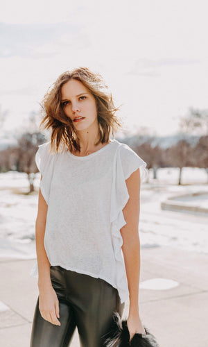 Velvet by Graham & Spencer has made a soft textured knit fabric for everyday comfort. When you wear the Alianna you won't want to wear a cardigan or sweater - you are going to want to show it off.  Along with its textural contrast, ruffles cascade down each side making it so chic, fun and fashionable.  The top features a rounded neckline, cap sleeves that are accented by the ruffles down the side of the top.  Available in Black, Fog (grey) and White. Fabric is 62% Viscose, 38% Polyester.  Machine wash cold. Tumble dry low. Made in USA.