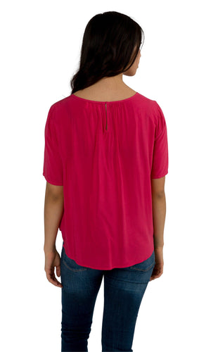 Simple yet sophisticated is Velvet by Graham and Spencer's Aliss top.   It features a gorgeous drape froet, perfect for day-to-day workwear. The angled panel on the front creates a wonderfully wrapped illusion.  This pullover style blouse has subtle detail pleating at the neckline.  The short sleeve shirt is topped with a single key hole button closure at the back of the scoop neckline.  Keep your workweek look on trend with either color; available in Postman (blue) and Gumdrop (red). Fabric is 100% Viscose.   Machine wash. Measures 23 1/2' long, measured from the center back.  Made in China.