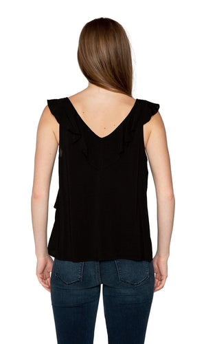 One of the newest additions to designer Velvet by Graham & Spencer's Rayon Challis collection, the April Rayon Challis Ruffle Top is the perfect tank featuring a super soft washable rayon and a feminine ruffle around the neck and shoulders making this a dressy and easy to wear piece. The tank blouse features a v neckline in both front and back accented with ruffles. The body of the tank features an approximately 1 inch strap/sleeve covered with the ruffle that is approximately 2.5 inches wide giving the look of a wider sleeve. The tank length hits approximately at the hips. Available in Black or Lantern (red). Fabric is 100% Viscose. Machine wash, tumble dry low. Made in China.