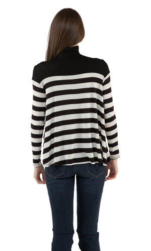 Fun and functionality is what Velvet by Graham and Spencer Aretha's Striped Lux Gauze Top is all about. This long sleeve striped top is soft to the touch made from cotton gauze. This top has a roll neck with a contrasting shoulder panel. There is also a slightly trapeze silhouette through the body which makes this top architectural and airy all at once. Add a little kick to your wardrobe with Aretha Striped Lux Gauze Top. Available in Black/Cream. Fabric is 96% Tencel, 4% Lycra. Machine Wash. Measures 24" long, measured from the shoulder. Made in USA.