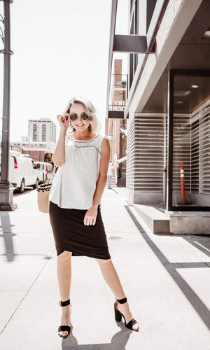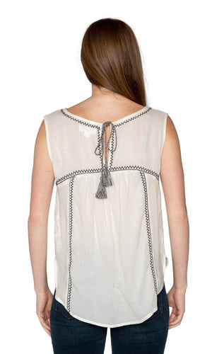 The Asera by Velvet by Graham and Spencer is the truly distinctive embroidery crepe sleeveless top. Black embroidery contrasts nicely with the ivory around the neckline and traces the seams of this crepe sleeveless blouse. The tasseled drawstring ties in the back and lends itself to a bohemian feel. Available in Off-White. Measures 24 1/8" from the center back. Machine wash cold, tumble dry low. Fabric is 53% cotton, 47% viscose. Made in India.