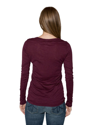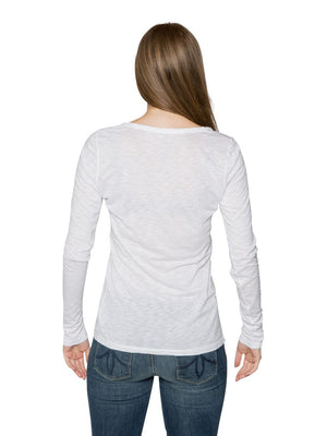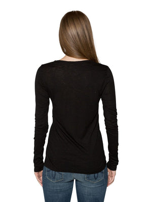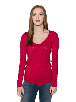 Like any other article of clothing, fit is key to looking stylish and put together. With Velvet by Graham and Spencer's Atlanta Lux Slub V Neck Top you can do just that. This long sleeve tee is super soft and v neck line is flattering. Wear a color that you love and one thats flattering on you. The Atlanta comes in colors; Black, Eggplant, Hibiscus and White. You can accessorize with a scarf or jewelry to bring out more color. Made in USA. Machine Wash. Fabric is 50% Cotton and 50% Modal. Measures 25" long, measured from the shoulder.