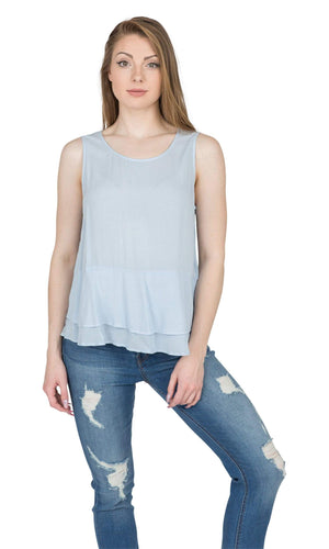 One of Velvet's newest editions in their Rayon Challis collection. The Betsey top features a sleeveless body with added feminine details with a subtle ruffle at the bottom. The back features a button closure at the neck. The rayon challis fabric is ultra soft and comfortable to wear. Available in Billow (Light blue) and Black. Fabric is 100% Viscose. Machine wash cold, tumble dry low. Made in China. Measures 37 1/4" bust, 1" below the armhole and 22 5/8" long, measured from the center back.