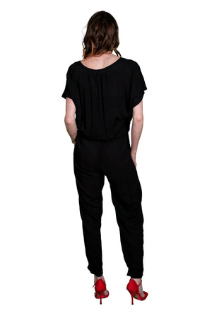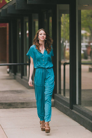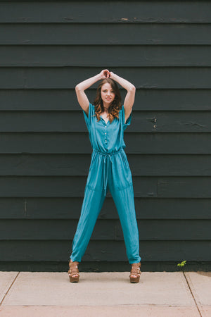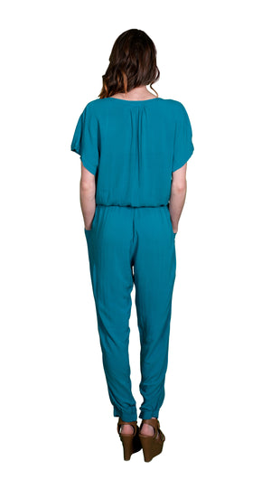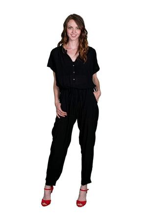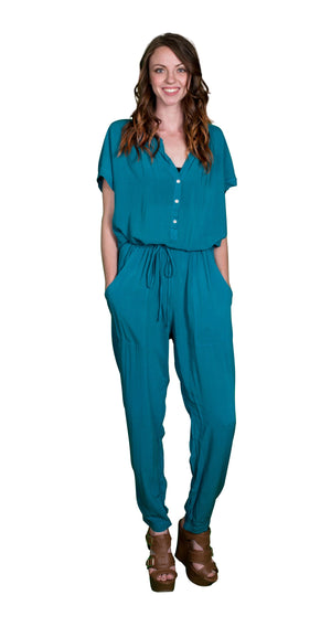 Jumpsuits are a must have style trend this season and the Cassia Rayon Challis Jumpsuit is a true statement piece for your closet. Like most jumpsuits the Cassia has a drawstring waist and a looser fit, but where it differs are the button up front, the tapered ankle and the front pockets at the hips. The Cassia also showcases a great style for the draped look of their Rayon Challis collection featuring a great machine washable rayon fabric that makes this jumpsuit even more versatile. The back cuff at the ankle features a gathered elastic to give you flexibility to wear it over different types of shoes/boots. The jumpsuit is full-length and the top body of the Cassia does have a loose / oversized style and fit. Available in Black and Pennant (Teal). Fabric is 100% Viscose. Measures: 20 1/8" long, measured from the shoulder to waist and 28 1/4" inseam. Machine wash cold, tumble dry low. Made in USA.