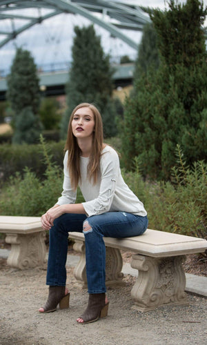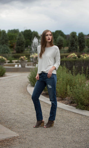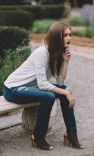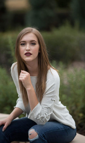 Try a fresh look this season in this lace-up-sleeve top by Velvet by Graham and Spencer.  The Cliona pull over cozy jersey will be sure to be a game changer.  This cozy ribbed sweater is anything but basic with popular grommet criss cross lace-up detailing on the arms.  The soft jersey fabric ensures you're effortlessly comfort.  Wear this top with your favorite jeans for a winning combination. Available in Ash (Light Grey) and Blush (Pink).  Fabric is 96% Viscose, 4% Elastane. Hand wash, lay flat to dry.  Made in USA   Measures 42 1/2" Bust, 3" below the armhole.   Measures 21" long, measured from the shoulder.