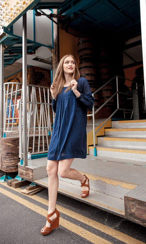 This adorable frock dress from Velvet by Graham and Spencer called Coel will give you effortless style. The soft blue textured cotton fabric delivers with details that features pleating on the yoke and pintucking on the arms. The loose fitting silhouette with a detachable slip is flattering for any figure type. You will be out the door showing off your style with great ease in this long sleeve dress. Available in Navy. Fabric is 100% Cotton. Hand wash, lay flat to dry. Measures 36 1/4" long, measured from the shoulder. Made in India.