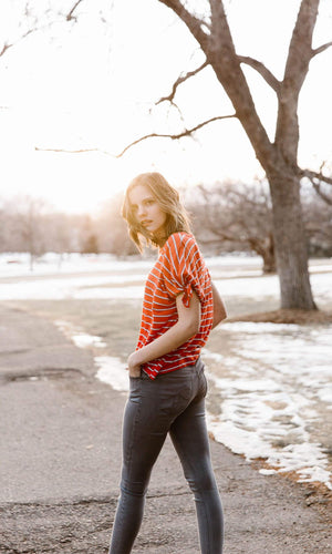It's practically a given that you can't go wrong with stripes. Â Velvet by Graham and Spencer has constructed the Crystal Striped knit sleeve top with horizontal stripes that stretch across the whole profile of this shirt adding a refreshing finish to your outfit. Â The Crystal has been crafted from this super soft cotton modal knit you'll fall in love with. Â Other details to this top are the tie detailed short sleeves, rounded neckline, and a seam down the center of the back. Team this top up with your favorite jeans. Â Available in Ice (Blue) and Rouge (Red). Fabric is 35% Modal, 35% Cotton, 30% polyester. Â Machine wash cold. Â Tumble dry low. Made in USA.