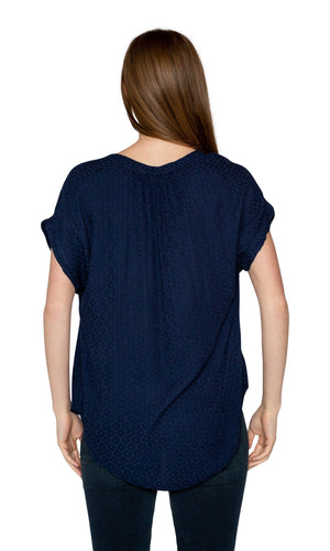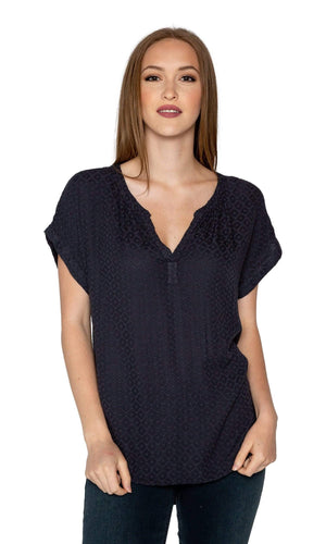 The Devanee by Velvet by Graham and Spencer features a loose and flowy style with pretty capped sleeves. It has a pintuck detail at the nape of the neck and buttonless half-placket. This short-sleeve popover top is perfect for home or the office. Pick from three colors; Viking (Blue), Black or Anise (Grey). Fabric is 100% Viscose. Machine Wash. Measures 25 3/8" long from the shoulder. Made in USA.