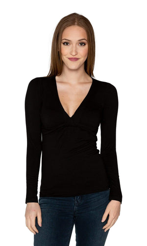 The Nolly top by Velvet is a classic staple piece for every closet featuring long sleeves and a deep v neck accented with an empire waist. The top is ruched around the bust and showcases Velvet's amazingly soft rayon fabric. Available in Black. Fabric is 95% Rayon, 5% Spandex. Dry clean only. Made in USA.